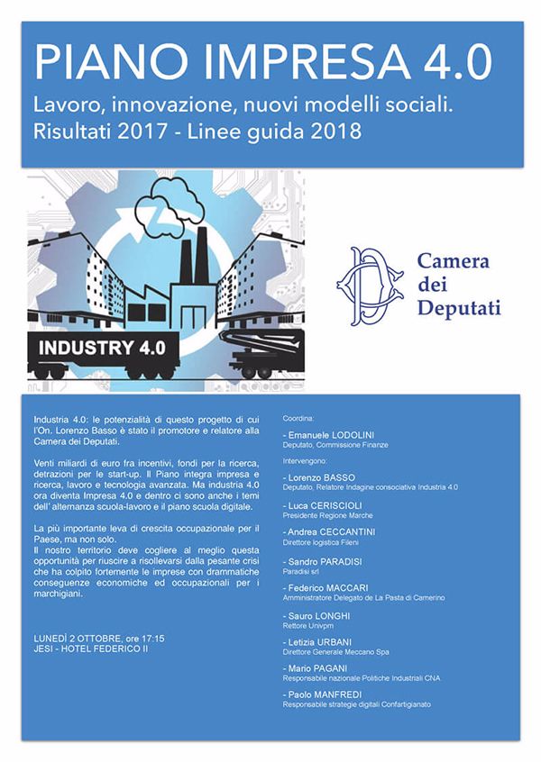 Al convegno tenutosi a Jesi lo scorso 2 ottobre, coordinato dall’On. Emanuele Lodolini, membro della Commissione Finanze della Camera, sono stati illustrati i risultati già ottenuti nel corso del 2017 e sulle linee guida per il prossimo anno previste dal piano che integra impresa e ricerca, lavoro e tecnologia avanzata.
